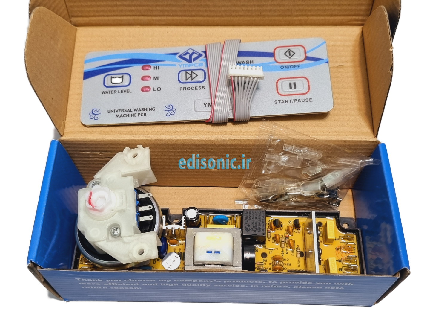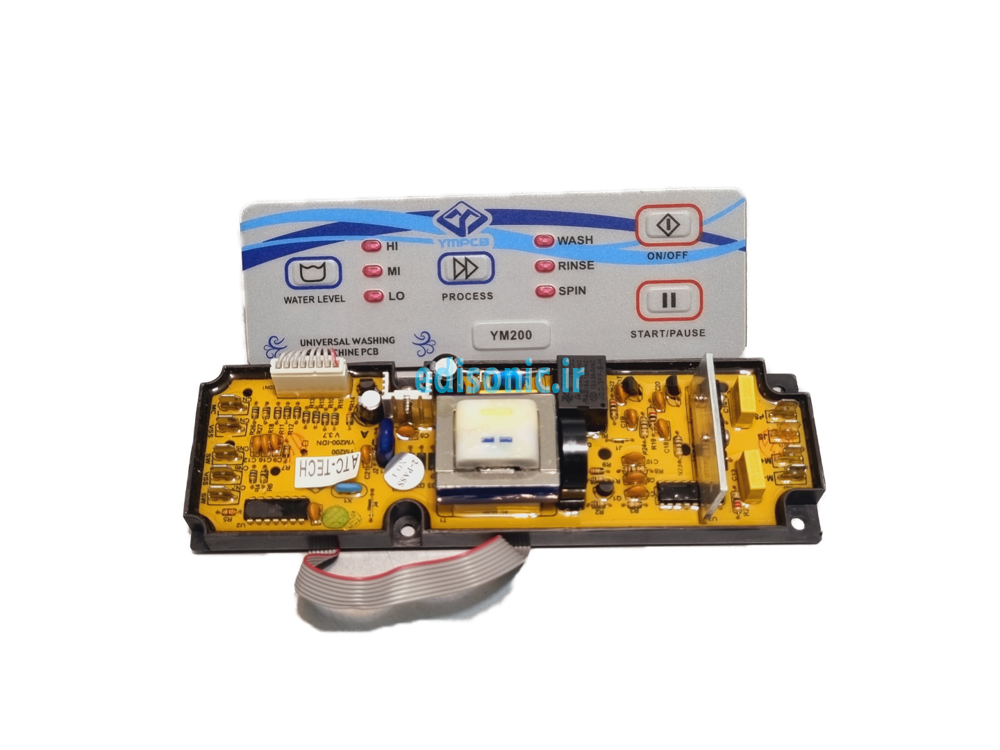 این محصول یک برد الکترونیکی کنترل کننده و نمایشگر ماشین لباسشویی مناسب برای ماشین های لباسشویی درب از بالا بر اساس موتور خازنی است که از دو برد متصل به نمایشگر و مدار برق تشکیل شده است.